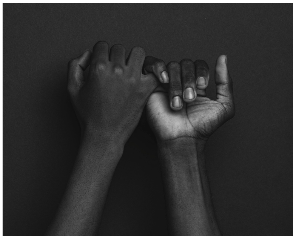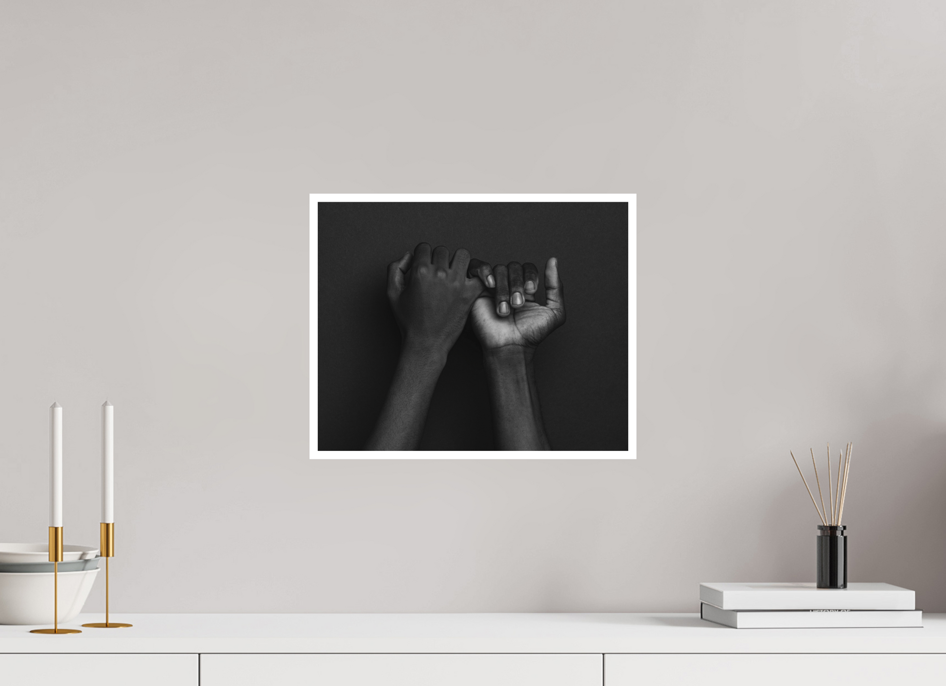 A black-and-white pinky promise gesture, Minimal and intimate, a monochrome study of human connection. Two hands lock fingers in a pinky promise, symbolizing trust and unspoken bonds.