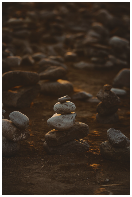 Smooth river stones stacked in quiet harmony, captured in the glow of fading light. A meditation on balance, patience, and the strength found in stillness.