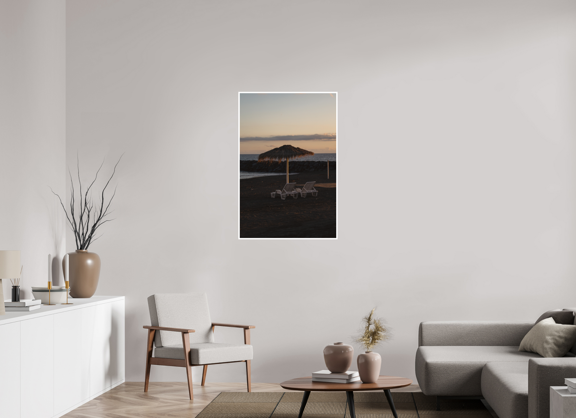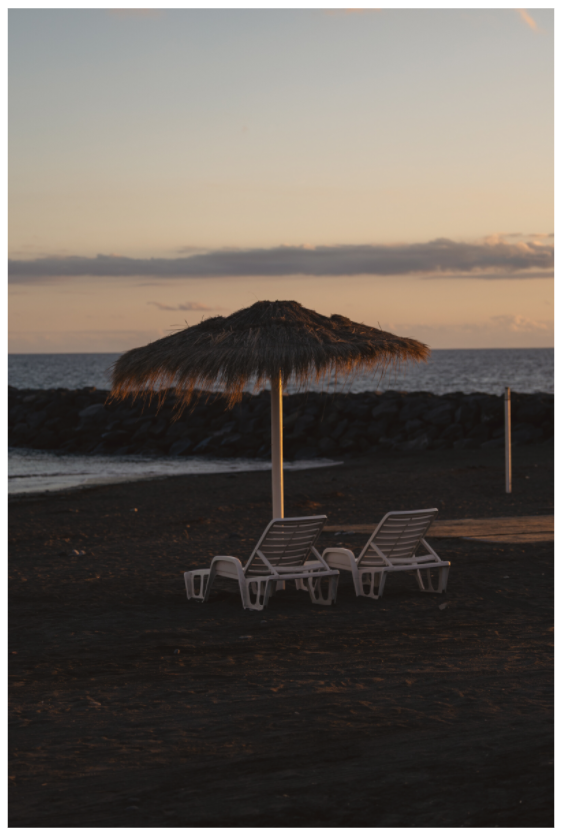 Empty chairs and umbrella at sunset. A deserted beach at dusk, with soft light and muted tones, speaks of rest and reflection.