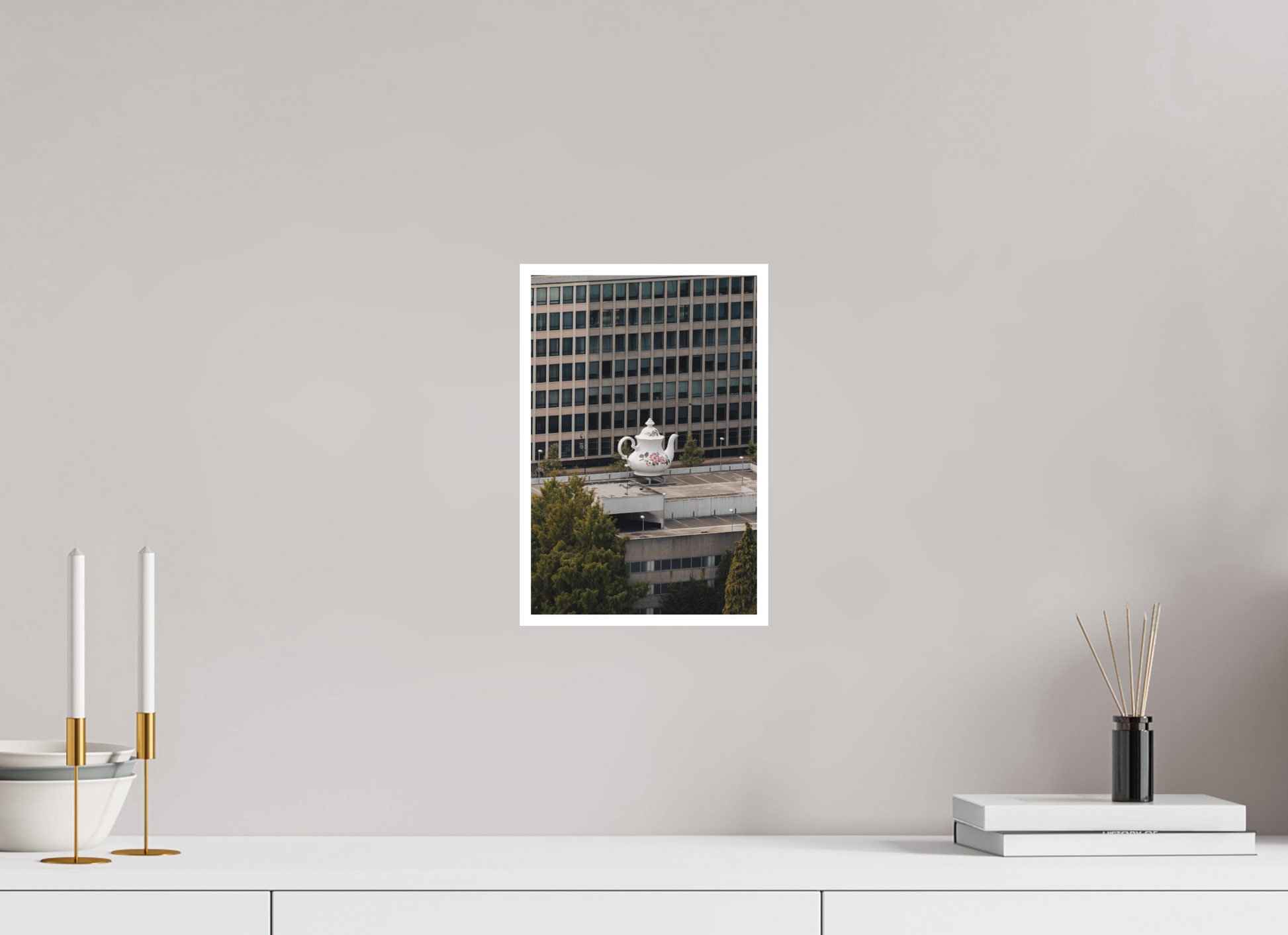 This whimsical Utrecht photograph captures a teapot balanced on a rooftop. A unique piece of travel wall art blending humor, architecture, and storytelling.